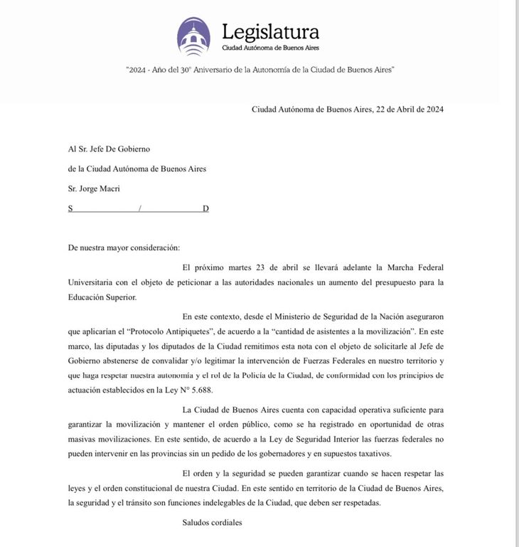 De cara a la marcha universitaria, 30 diputados de la Legislatura porteña de UxP, la UCR, PS y Confianza Pública le enviaron una nota a Jorge Macri solicitando que no convalide la intervención de Fuerzas Federales para que no apliquen el protocolo antipiquetes de Patricia Bullrich.